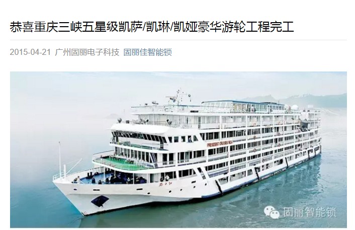 作為 長江三峽豪華游船 中的佼佼者--凱蒂號游船,再次選擇與我們固麗佳合作,既是對固麗公司的信任,同時也是對固麗佳品牌及產品酒店門鎖的信任。